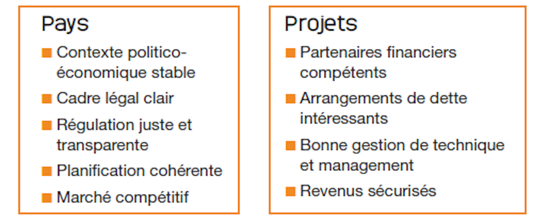 L’existence d’une agence indépendante de surveillance de l’énergie semble indispensable bien qu’insuffisante. 29 pays d’Afrique subsaharienne en sont aujourd’hui dotés, avec des performances inégales. Sont aussi identifiés des prérequis au niveau du pays hôte et du projet, comme un niveau de corruption faible, une bonne planification, un cadre légal cohérent et une réforme des marchés de l’électricité. Ces éléments sont essentiels pour créer un cercle vertueux pour les acteurs privés notamment en matière d’innovation.