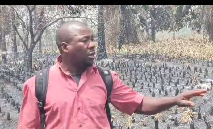La totalité de la parcelle agricole est partie en fumée, laissant Fodé Mohamed Soumah dans le désarroi.