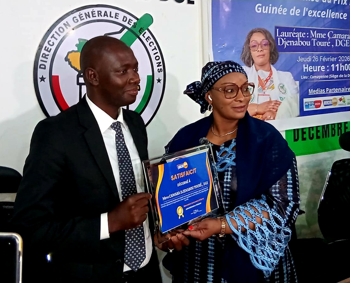 Les Prix Miroir Guinée de l’Excellence, Africain Almamy Samory Touré de la Bravoure Féminine 2025, ainsi que celui de Tamara Magazine ont été remis, ce jeudi 26 février 2026, à Mme Camara Djenabou Touré, directrice générale des élections (DGE). La cérémonie de remise s’est déroulée au siège de l’institution, à Camayenne, en présence de plusieurs acteurs politiques.