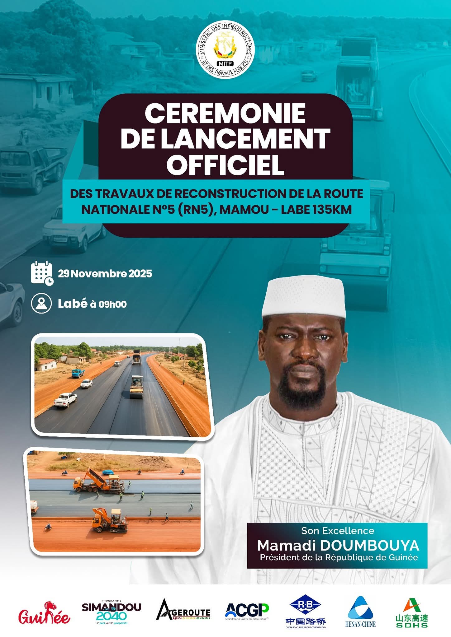 Le Ministère des Infrastructures et des Travaux Publics a annoncé ce mercredi le lancement officiel des travaux de reconstruction de la Route Nationale N°5 (RN5), longue de 135 km, reliant Mamou à Labé. La cérémonie de lancement est prévue le 29 novembre 2025, marquant le début d’un chantier crucial pour l’amélioration de la mobilité dans la Moyenne Guinée. Considérée comme l’un des axes routiers les plus stratégiques du pays, la RN5 joue un rôle clé dans le transport des personnes et des marchandises entre les régions.