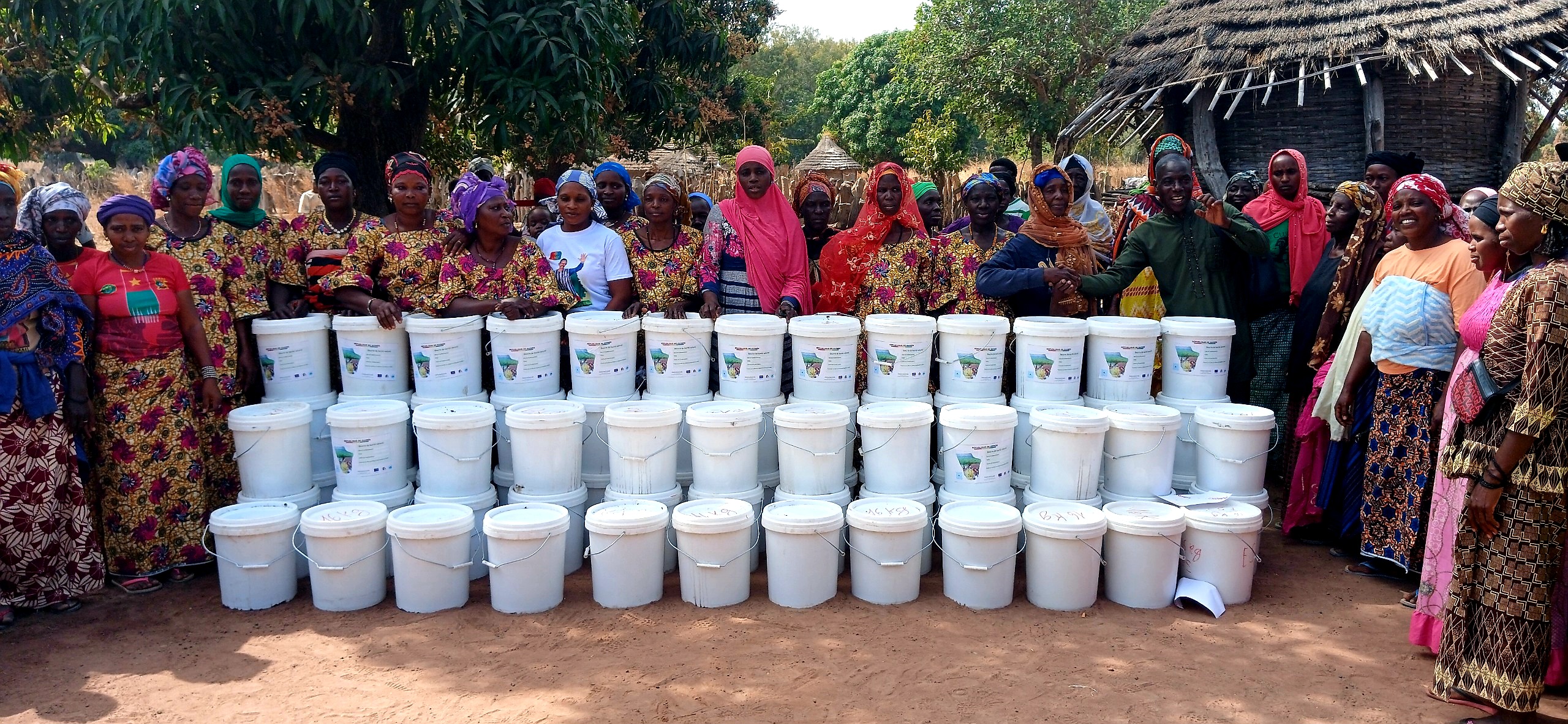 Afin d’améliorer la qualité et la quantité de la production, la WCF a, à la suite de sessions de formation avec les GIE, doté les productrices de sacs de ramassage de noix de karité, de bâches pour le séchage et de sacs en jute pour le stockage des amandes issues du décorticage.